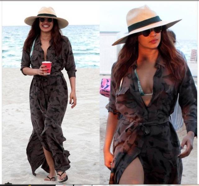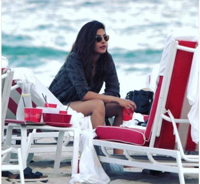प्रियंका की नाभि पर दो बटन छिदे हुए दिखाई दिए जो बहुत खूबसूरत हैं, समुद्र तट पर आनंद लेने के बाद, प्रियंका ने बिकनी पर एक खाकी रंग का जैकेट भी पहन ली